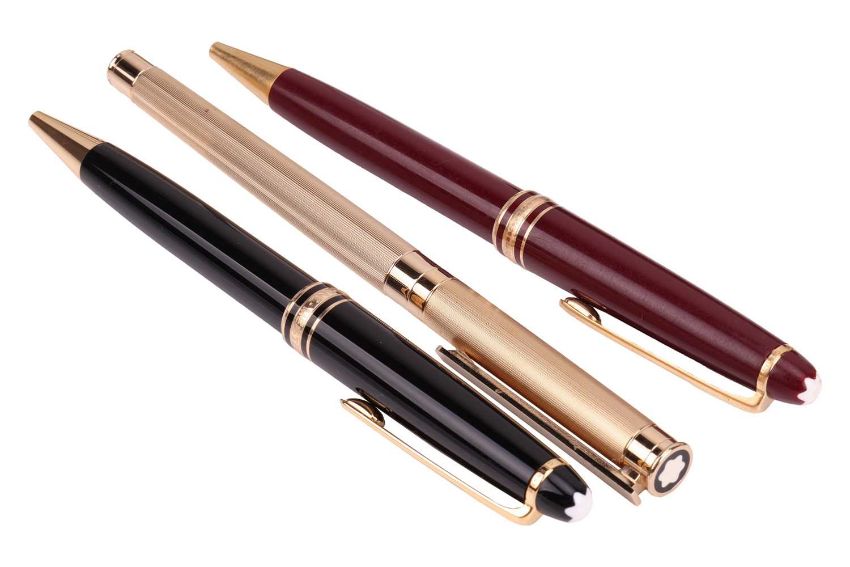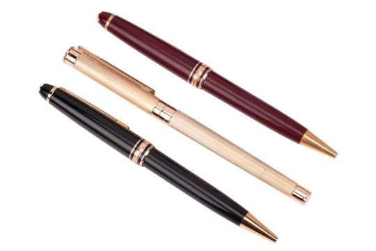 Montblanc - a gold-tone Noblesse fountain pen with a striated barrel and cap, nib in yellow metal marked '750', cased; a Meisterstück Classique ballpen in burgundy, and another one in black, both have gold-tone hardware, signed and numbered; together with a bottle of black ink with Super-Cleaner SC21. (4)