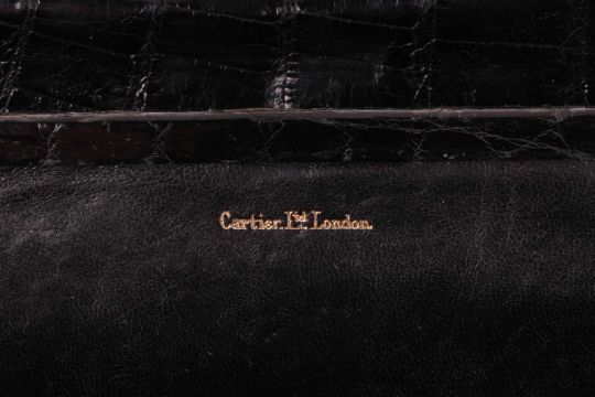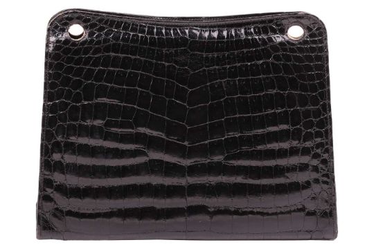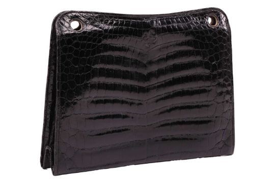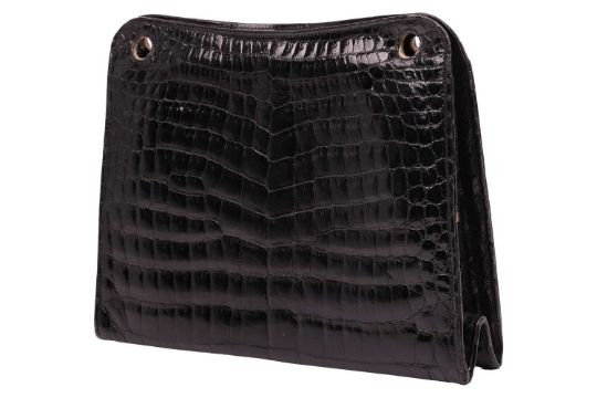 Cartier - an evening handbag in black crocodile skin leather, circa 1960s, of rectangular shape, kisslock closure, calf leather lined, signed 'Cartier Ltd. London', all hardware including straps have been removed. W24.5 x H19.0 x D7.0 cm.