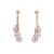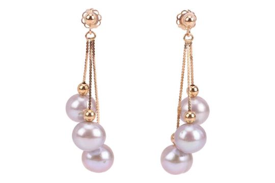 Two pairs of earrings; to include a pair of tassel earrings with cultured pearl drops, on fine serpent links to a beaded surmount with peg and butterfly fittings, yellow metal stamped '14K', 3.5 cm drop; and another pair of stud earrings of trefoil design, each set with three glass spherical beads, yellow metal surface testing as 14ct; total weight of items 5.2 grams. (2)