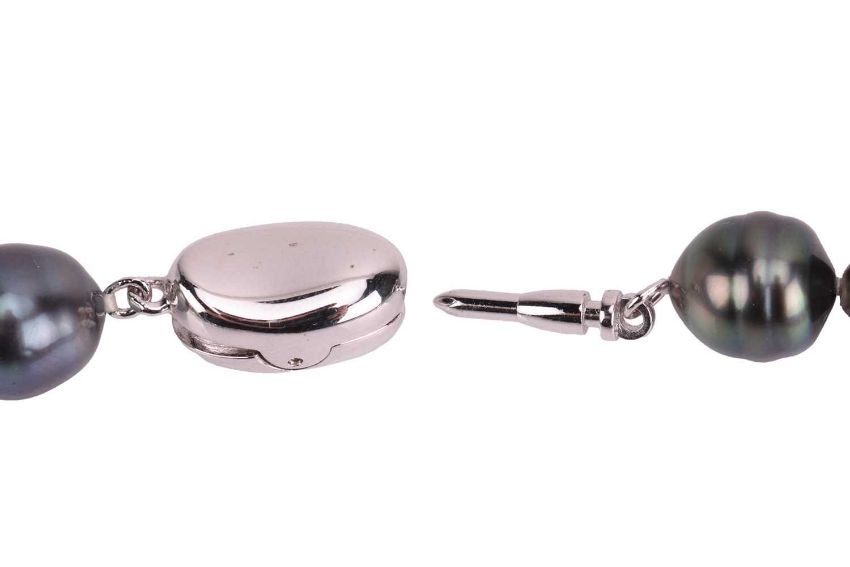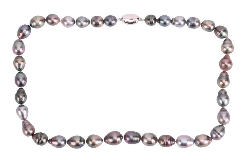 A Tahitian cultured pearl necklace, comprising a string of baroque pearls in different shades of grey colour, completed with a pin clasp marked silver top GSV bottom patent, 45.0 cm long, 49.7 grams.