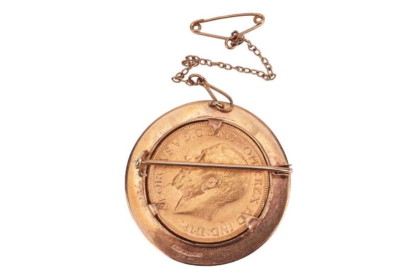 A 1914 George V full sovereign mounted in 9ct gold, in a detachable circular surround engraved with scrollwork patterns, brooch fittings to the reverse, British hallmarks, 3.0 cm wide, 10.4 grams.