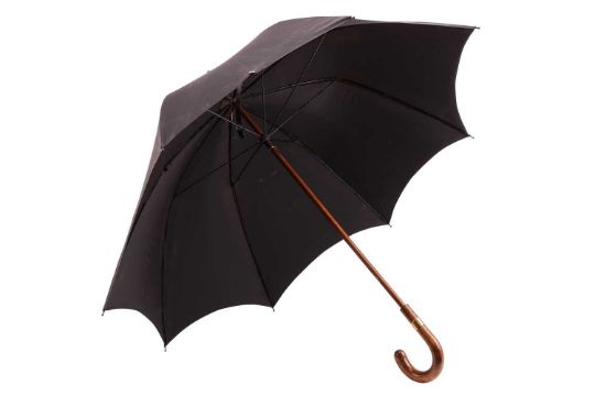 A Briggs London black umbrella with gilt metal collar signed Briggs, to a curved wooden handle.