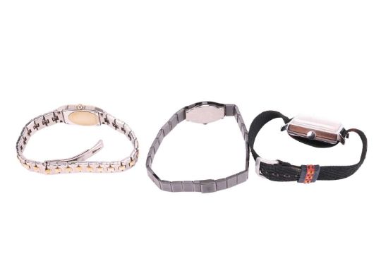 A group of three watches; The first a Movado wristwatch, reference 84-40-881A, with 22mm case, black dial and gold-tone dauphine hands, no numerals, integral strap, signed push-button release clasp, inner circumference approximately 17.25cm, quartz movement; The second a Girard-Perregaux stainless steel wristwatch, 20mmx 22mm case, enclosing a gold-tone dial with gem-set numerals, integral strap, fold-over clasp, quartz movement; The third a Tian Harlan wristwatch, 28mm case, enclosing a rainbow segmented dial with central black indicator, ASST seventeen jewel manual wind movement, black fabric strap; Gross weight of all pieces approximately 107.0 grams (3).