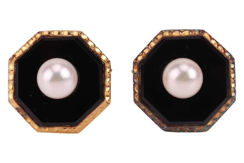 A pair of octagonal panel cufflinks set with onyx and cultured pearl, toggle back, stamped 'K18 GF' for gold-filled.