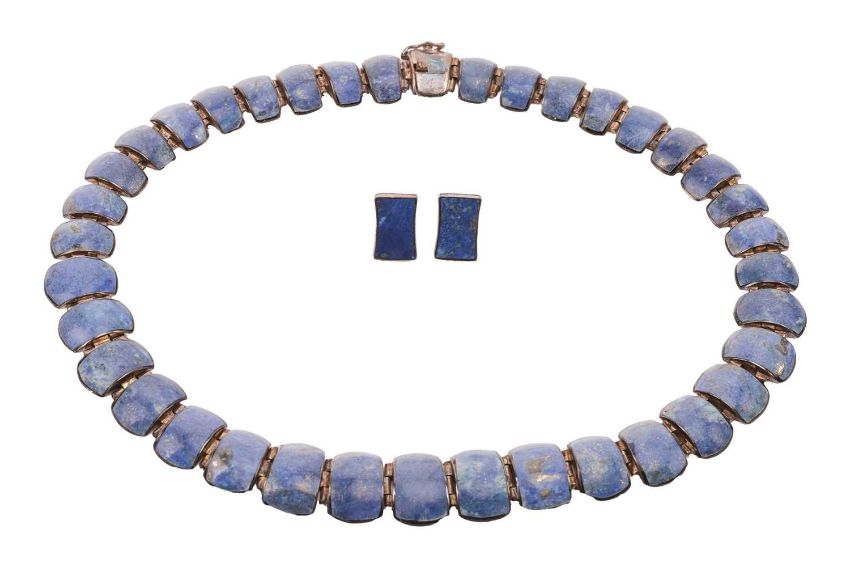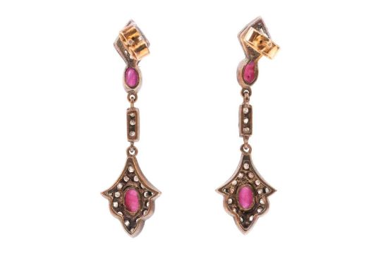 A boxed lapis lazuli necklace and earrings suite, set with graduated polished lapis lazuli panels in hinged white metal mounts, completed by a box clasp; with a matching pair of stud earrings; together with a pair of ruby cabochon and rose-cut diamond drop earrings, with post and butterfly fittings, surface testing as silver and 18ct, 4.0 cm drop. (3)