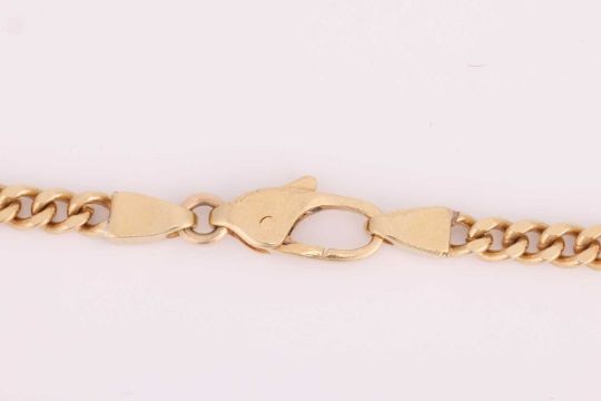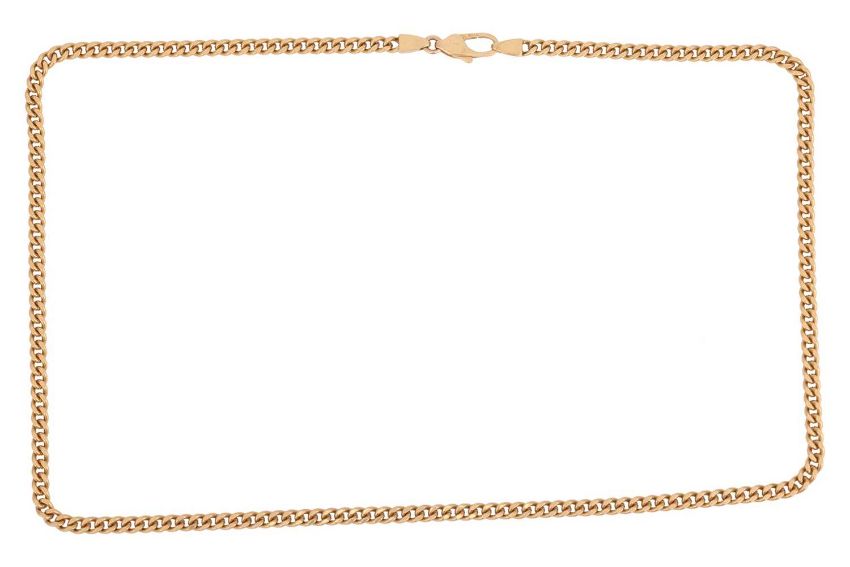 A flat curb link necklace, completed with a lobster clasp, yellow metal stamped '18ct', overall length 58.0 cm, 38.76 grams.
