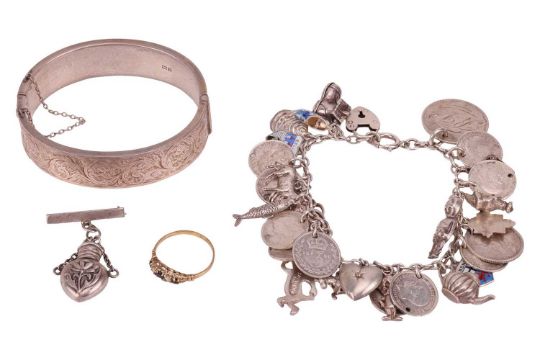 A charm bracelet, with silver and white metal charms; a silver hinged bangle with engraved scrollwork design, a 9ct ring set with pastes, size R, 1.3g; and a white metal bar brooch, with suspended scent bottle; total weight of items 95.7 grams.