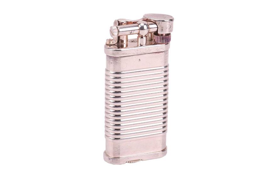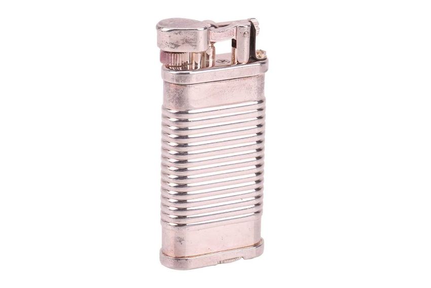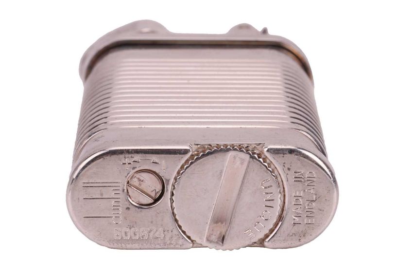 Dunhill Unique 'Tin Can' lighter, silver-plated on brass, signed and numbered, no box, 6.5 cm tall.