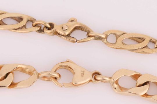 A fancy curb link necklace measuring 46.0 cm long, yellow metal stamped '18ct'; together with a flat curb link bracelet 18.0 cm in length, yellow metal stamped '750'; total weight of items 42.92 grams. (2)