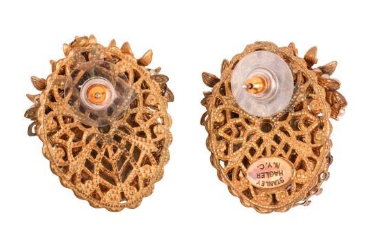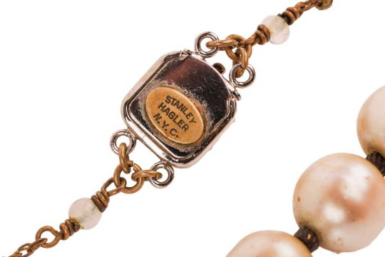 Stanley Hagler - An imitation pearl and paste necklace, together with a pair of earrings; the necklace comprising a strand of baroque imitation pearls, with spacers in between on a loose rope chain, completed with a beaded box clasp, 44.0 cm long; the pair of earrings each set with a large round simulated mabe pearl, with a floral cluster surmount, peg and butterfly fittings, 3.2 cm drop; both items are signed 'Stanley Hagler N.Y.C'. (2)