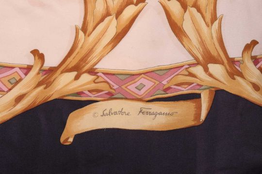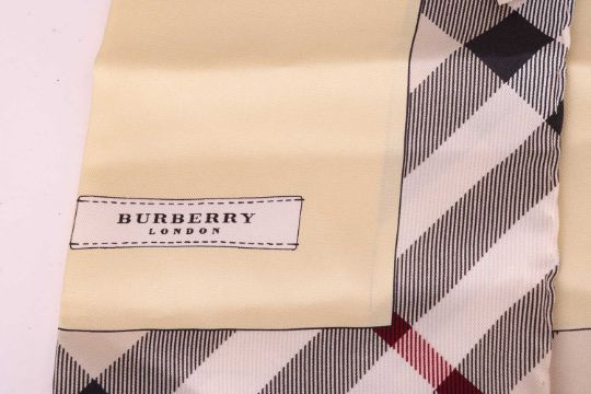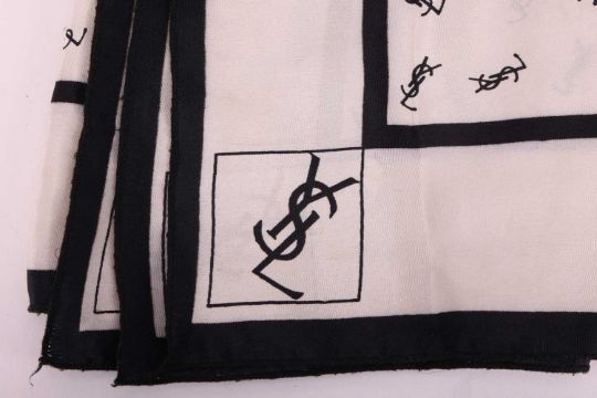 A collection of six designer scarves; comprising a Burberry silk scarf in butter yellow and tartan border, a Burberry large silk scarf in tartan pattern, a Burberry cotton triangle scarf with tartan print, a Yves Saint Laurent logo square scarf in black and cream, a Ferragamo animal print scarf with fraying edges, and a Nina Ricci purple floral scarf. (6)