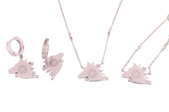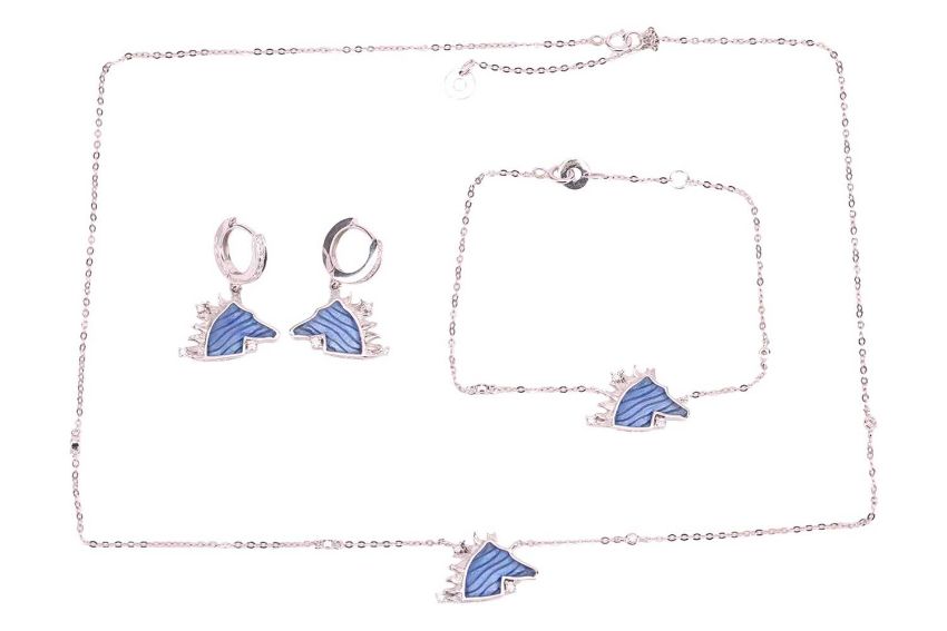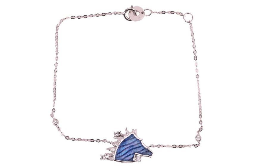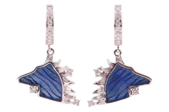A modern blue-glass and diamond demi-parure by Caratiff, comprising a necklace, a bracelet and a pair of pendent earrings, each with a horse’s head motif centred with a striated-blue-glass panel and small round brilliant diamond accents and laser-etched brand motif verso, the necklace with a central horse’s head motif marked ‘Au750’ & ‘d0.81ct’, on a white trace-link back chain with small diamond collets at intervals and a bolt ring clasp stamped ‘750’, 45.0cm long overall (17 ¾ inches), 3.2 grams gross; the bracelet of similar form stamped ‘Au750’ & ‘d0.06ct’, 2.5 grams gross; and the pendent earrings each with a small diamond nine-stone round surmount and hung with a swing horse’s head motif, marked ‘Au750’ & ‘d0.0.193ct’, approximately 24.0mm high overall, 5.5 grams gross; the set weighs 11.1 grams gross.