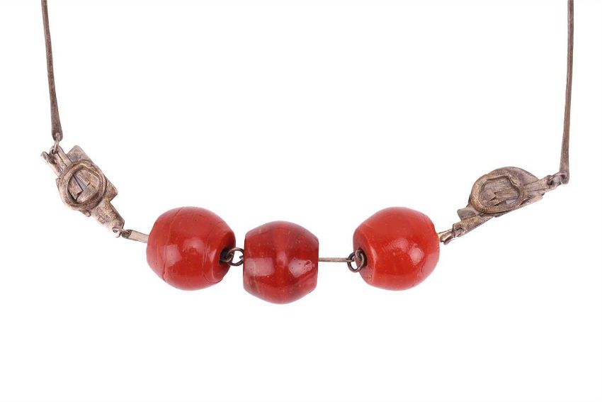 A modernist silver necklace with three barrel-shaped red glass beads, to a chain of elongated bar links, interspersed with flattened geometric motifs, and a conforming hook clasp, with hallmarks for London 1975, maker's mark "FJM", length 46.0cm, 47.7g.