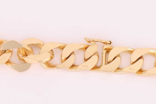 A long curb link chain, the heavy flat curb links connected with an integral conforming clasp, with figure of eight safety catch, yellow metal stamped '750', overall length 60.0 cm, 99.94 grams.