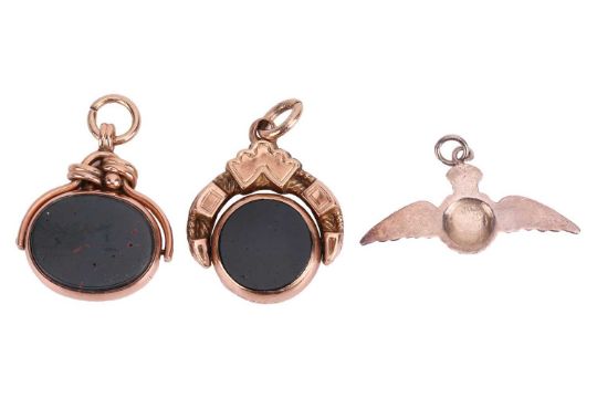 Two 9ct gold swivel fob seals, and a RAF enamel charm; both fob seals have vacant bloodstone and carnelian panels, to a decorated surmount, bearing British hallmarks for 9ct, 11.7 grams; together with an enamelled RAF charm in white metal testing as silver. (3)