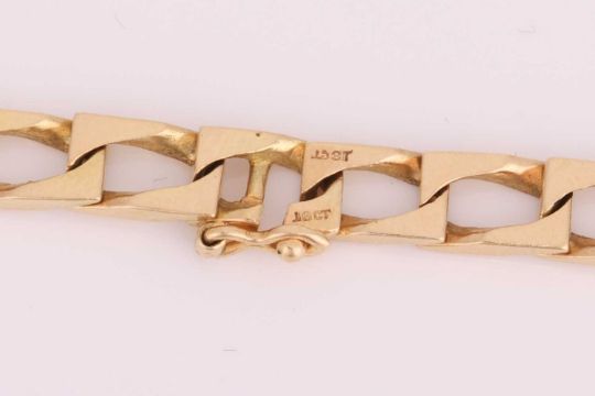 A square curb link necklace, comprising a series of rectangular flat curb links, completed with a conforming clasp with figure of eight safety catch, yellow metal stamped '18ct', 55.5 cm long, 41.22 grams.