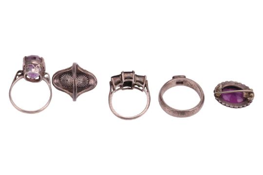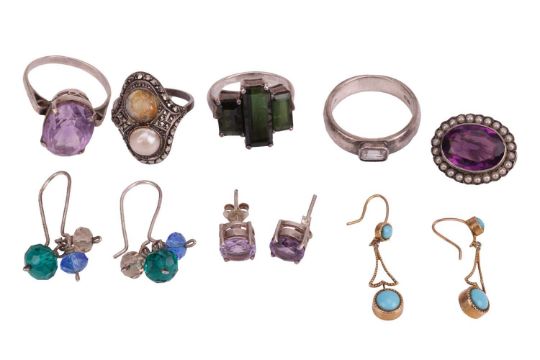 A group of jewellery items and a silver cigarette case; The cigarette case of curved form, with foliate and scrolled engraved detail and a vacant central cartouche, gilt interior, London hallmarks dated 1906, 8.0cm x 6.0cm, 60.5 grams; Together with a small collection of jewellery comprising a purple paste and seed pearl brooch, of scalloped oval form, in white metal marked '995' with pin and C clasp fittings, 2.0cm x 1.6cm; An amethyst cocktail ring, featuring an oval-cut amethyst, to a white metal ring shank surface testing as base metal, size R 1/2; A green tourmaline trilogy ring, featuring three graduating rectangular-cut green tourmalines, claw set in a base metal shank, size M; And other, such as a pair of amethyst ear studs, a blue topaz bracelet along with other earrings and rings.