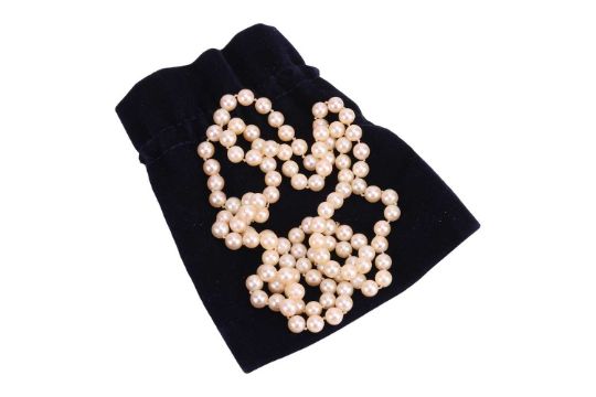 A single-row cultured pearl necklace, comprising a series of uniform round cultured pearls of approximately 7.4mm, in cream colour with rose overtones, the strand hand knotted and measuring approximately 95cm, 60.5 grams.