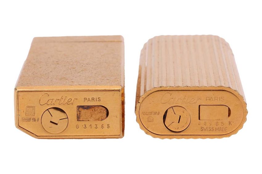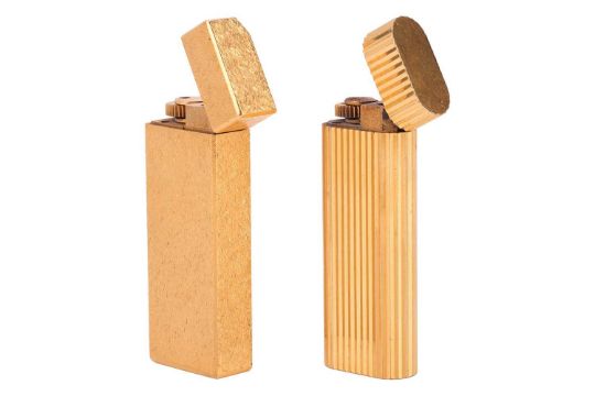 Cartier - two gold-plated lighters, one of grooved design, the other with crosshatch finish, signed and numbered. (2)