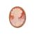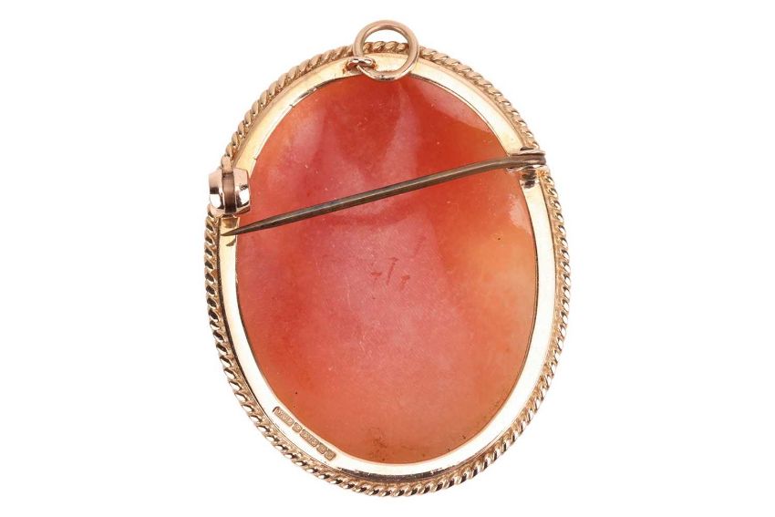 A shell cameo brooch cum pendant, depicting the bust of a lady, to a 9ct yellow gold frame with woven border detail, base metal pin fitting and locking C clasp and additional pendant loop, brooch measuring 3.8cm x 2.8cm, 7.5 grams.