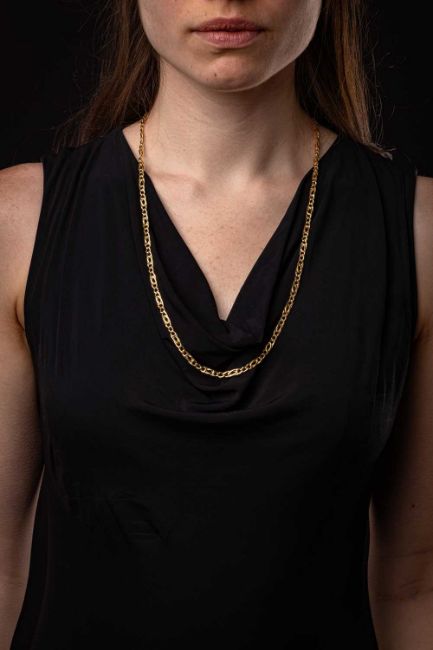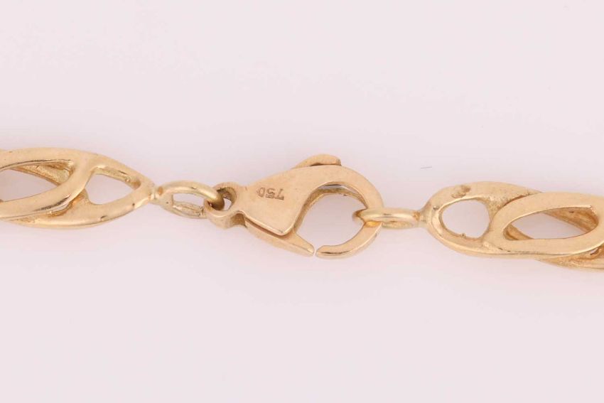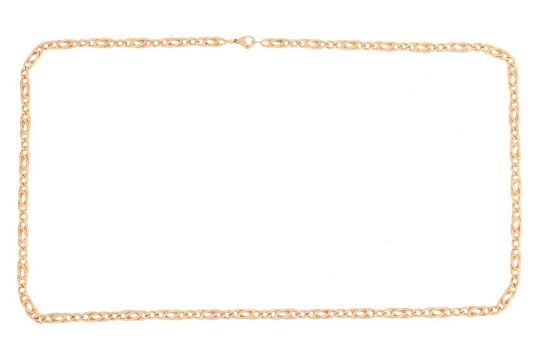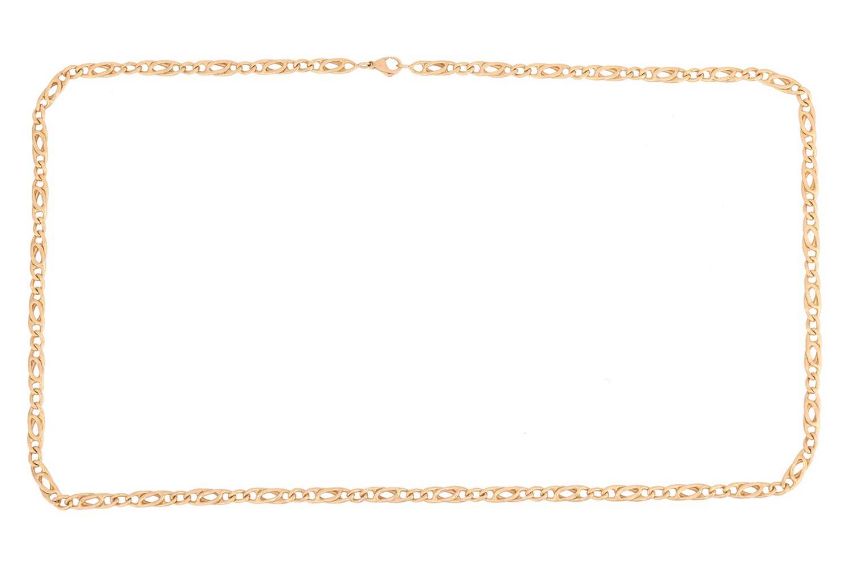 A fancy curb link necklace, completed with a lobster clasp, yellow metal stamped '750', overall length 67.0 cm, 32.16 grams.