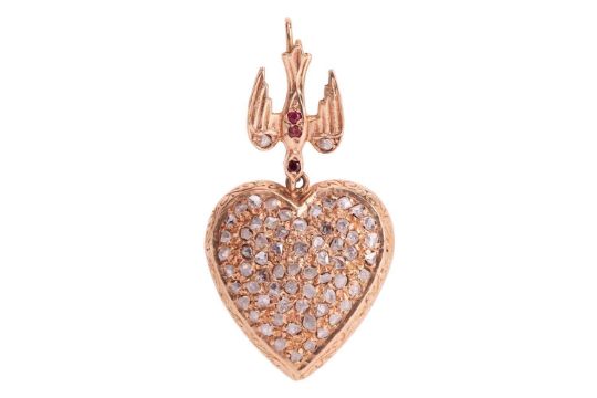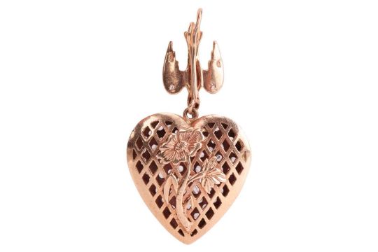 A heart-shaped pendant with diamonds, comprises a hollow heart pendant in yellow precious metal, fully pavé set with rose-cut diamonds, engraved scrollwork on the edges, pierced lattice and daisy motif at the reverse, suspending on a dove surmount with diamond and ruby accents, to a shepherd's crook bail, Syrian hallmarked '12ct', overall measuring 4.9 x 2.6 cm, total weight of item 10.0 grams.