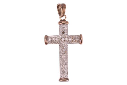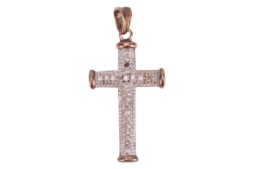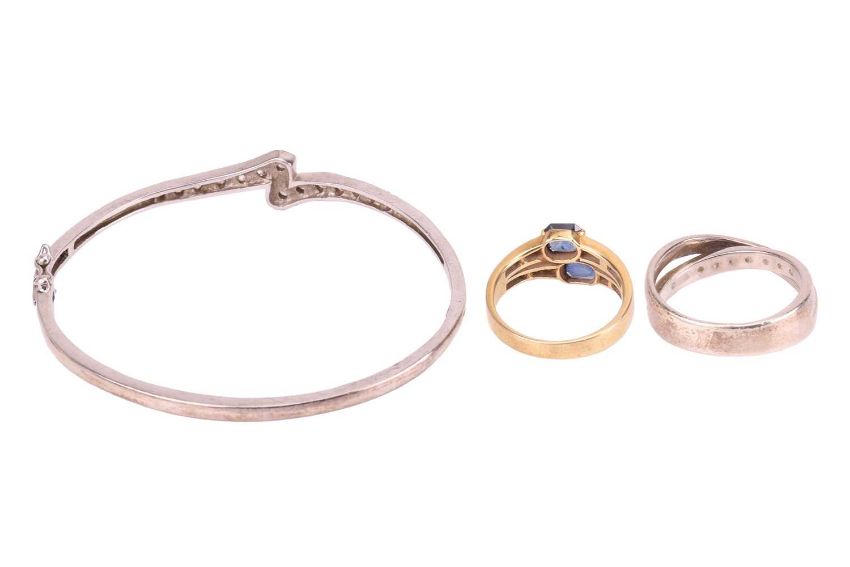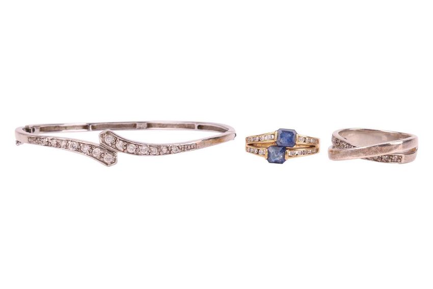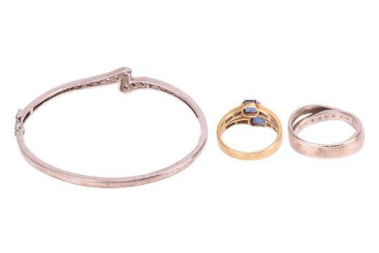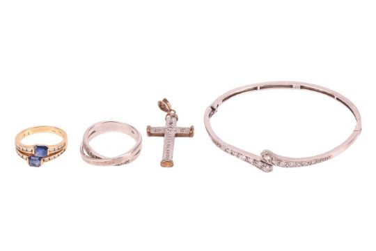 A small group of jewellery items comprising a paste-set hinged bangle, in white metal marked ‘925’, a diamond-set cross pendant, in bi-colour metal marked ‘9K’, a paste-set crossover ring in white metal marked ‘925’, size Q1/2, and a sapphire and diamond-set ring, in a yellow metal mount marked ‘585’, size M; 18.5 grams (4)