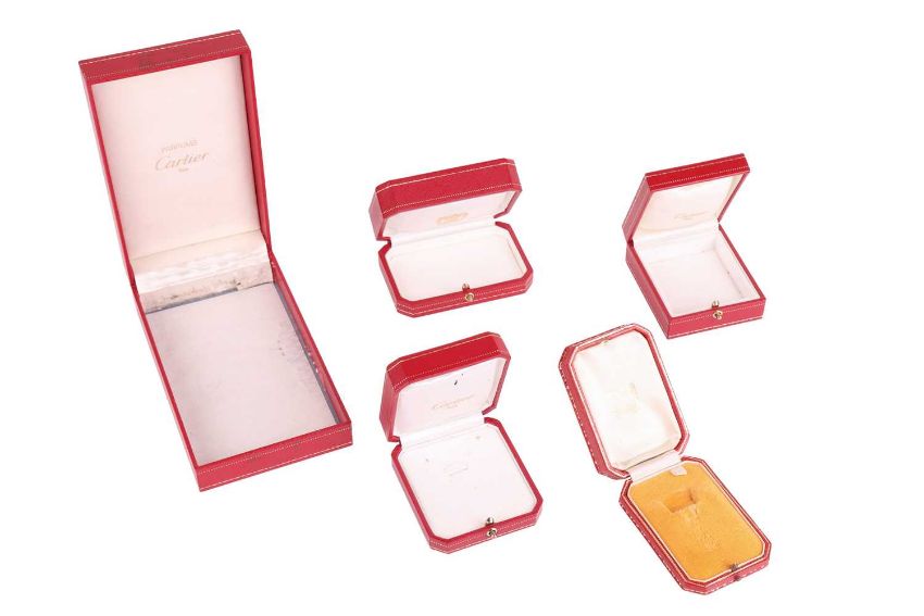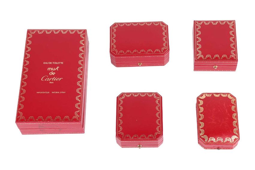 A group of four Cartier jewellery boxes, and a Must de Cartier perfume exterior box. (5)