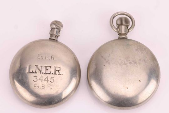 A group of watches and pocket watches; The first a 9ct gold Omega, reference 50967, serial 560962, the 15mm x 15mm case enclosing a silvered dial with gilt Arabic and Baton numerals, Omega calibre 244 17-jewel manual wind movement numbered '13088979', not running and wound tight, to an after-market gold-plated elasticated strap, 18.0 grams; The second a Broadwest gold-plated watch, reference 472745, the 30mm case enclosing a silvered dial wityh Arabic numerals, with seconds subsidiary dial at six o'clock, 15-jewel manual wind movement, currently running, to a black leather strap and gold-platyed buckle 27.0 grams; The third an Elgin white metal open face pocket watch, the 58mm case enclosing a white dial with black Roman numerals, with seconds subsidiary dial at six o'clock, keyless wound movement, currently running, 157.0 grams; The fourth a white metal open face pocket watch, the 58mm case enclosing a white dial with black Roman numerals, with seconds subsidiary dial at six o'clock, case back engraved with 'Ex.B.R. L.N.E.R. 3445 Ex.B.R.' keyless wound movement, currently running, 121.5 grams; A white metal Albert chain, with T Bar, completed at each end with lobster clasps, measuring 44.0cm in length, 20.5 grams.