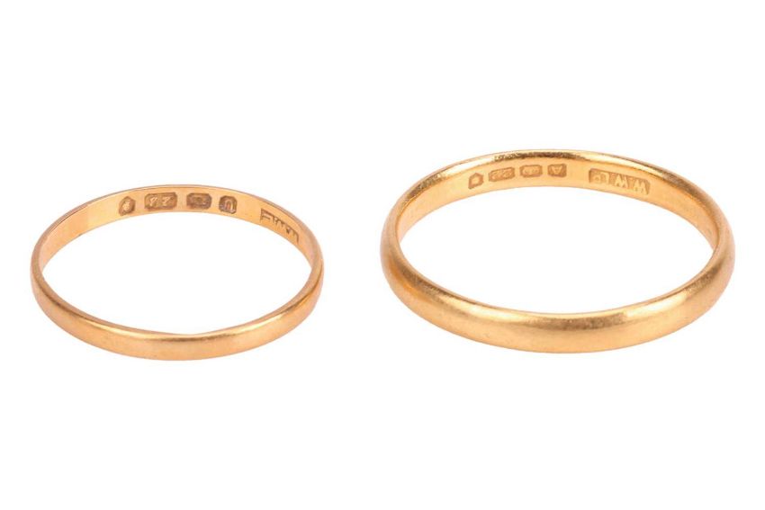 Two 22ct yellow gold wedding bands, of plain polished finish, court-profile, one in size M and the other size S; total weight of items 4.3 grams. (2)