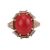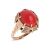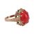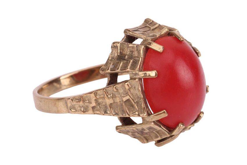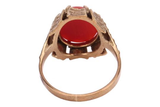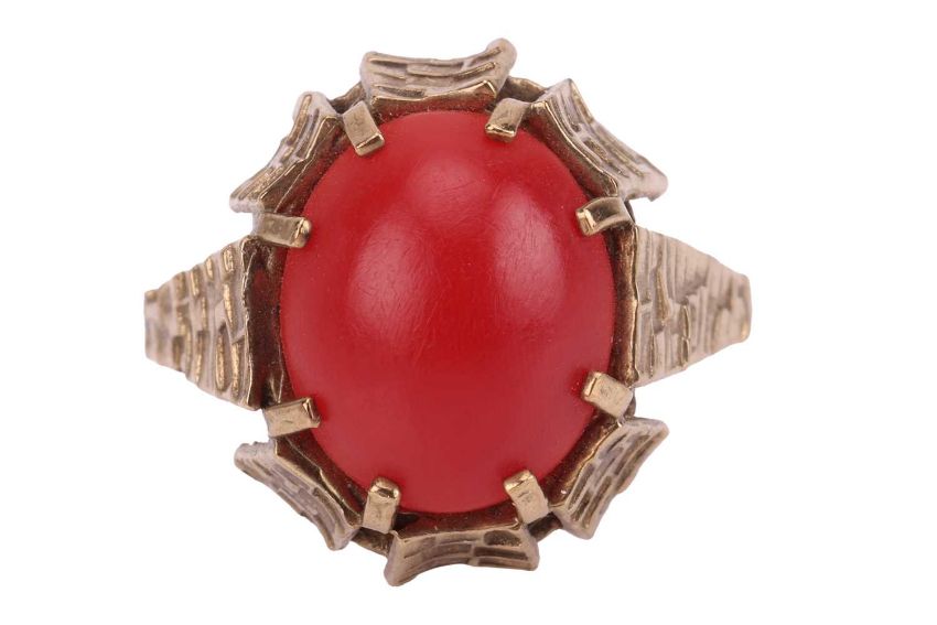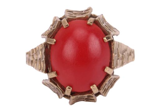 A coral cabochon dress ring, set to the middle with an oval corallium rubrum cabochon of 12.3mm x 10.1mm x 4.4mm, in a claw mount with brickwork texture, leading to a flat shank, yellow metal marked '333', size P, 3.6 grams.