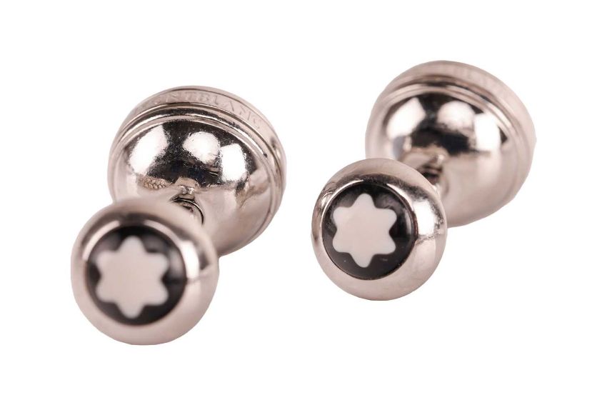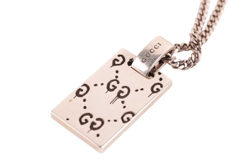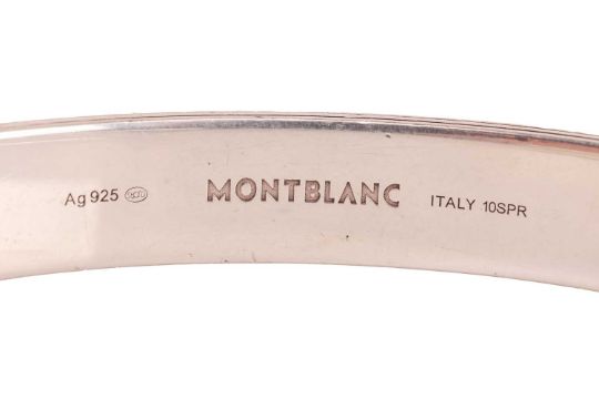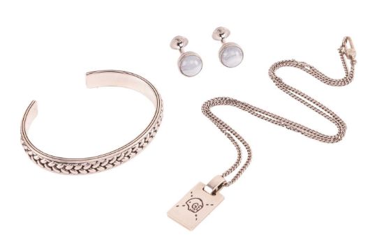 A Gucci ghost skull silver pendant on chain, a Montblanc open bangle, and a pair of cufflinks; the skull pendant with black enamel details, on a flat curb link chain, signed and Swiss hallmarked; the Montblanc open bangle of braided design, signed and marked '925', 6.6 cm wide; and a pair of Montblanc cufflinks set with blue lace agate cabochons, stamped 'Steel'; total weighable 60.0 grams. (2)