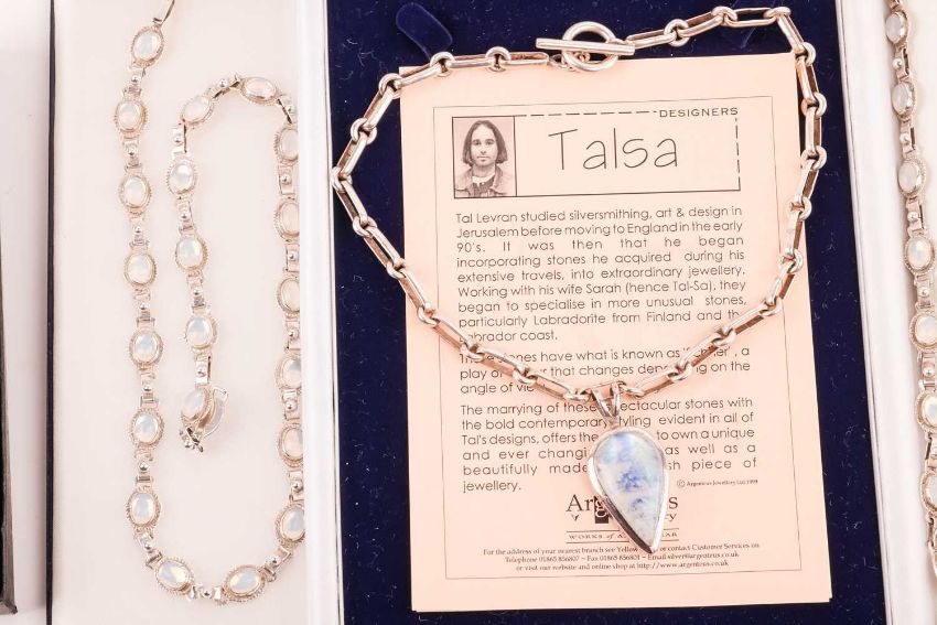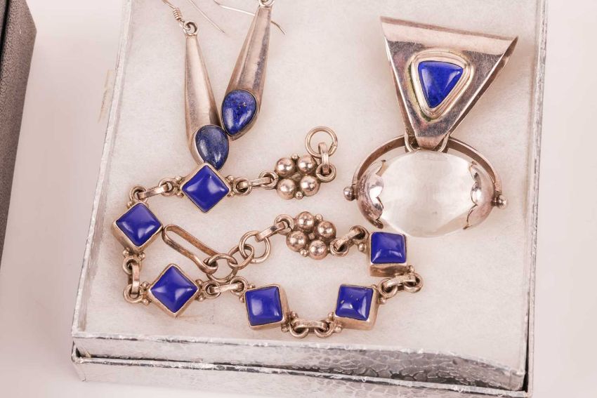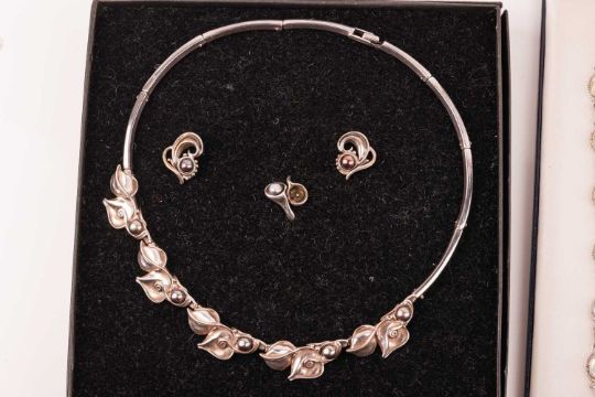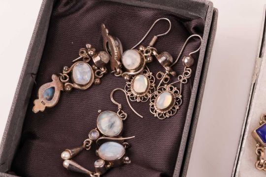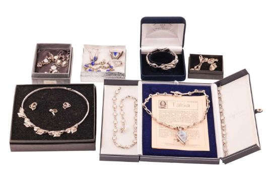A mixed group of jewellery items including a pearl-set silver bracelet, of organic design, signed ‘Hagrit’, together with a large labradorite-set silver necklace, a lapis lazauli-set pendant with matching bracelet and earrings, a small group of labradorite-set items and other silver jewellery items; 255.9 grams (15)