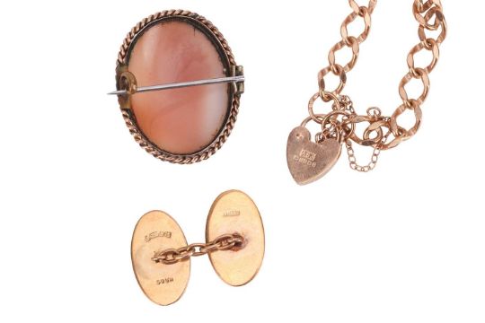 A small group of jewellery items, comprising a cameo brooch depicting the classical profile of a woman, to a woven border surface testing as 9ct, with base metal pin and C clasp, 3.2cm x 2.5cm, 6.5 grams; A curb link chain bracelet with 9ct gold heart padlock, 15.0cm in length, 8.0 grams; A single 9ct yellow gold cufflink, 3.0 grams; A cultured pearl pendant; A double cable-link chain in yellow metal surface testing as 9ct, completed with a spring-ring clasp, 22.0cm in length, 3.0 grams; A broken S-link chain, in yellow metal surface testing as 9ct, 0.5 grams. (6).
