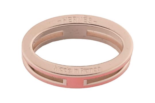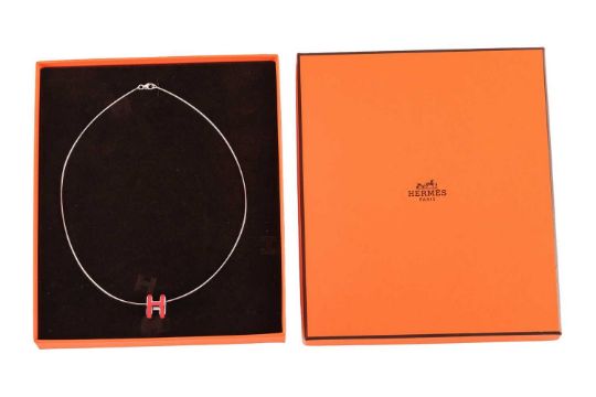 Hermès - A Mini Pop H pendant on chain, the gilt metal pendant with red lacquer, 1.6 x 1.4 cm, on a omega chain in white metal stamped '925', cased.