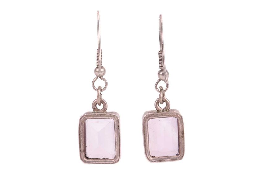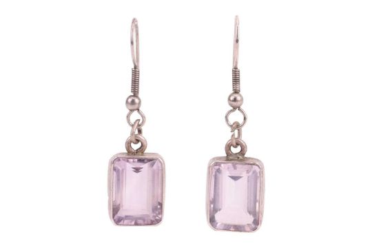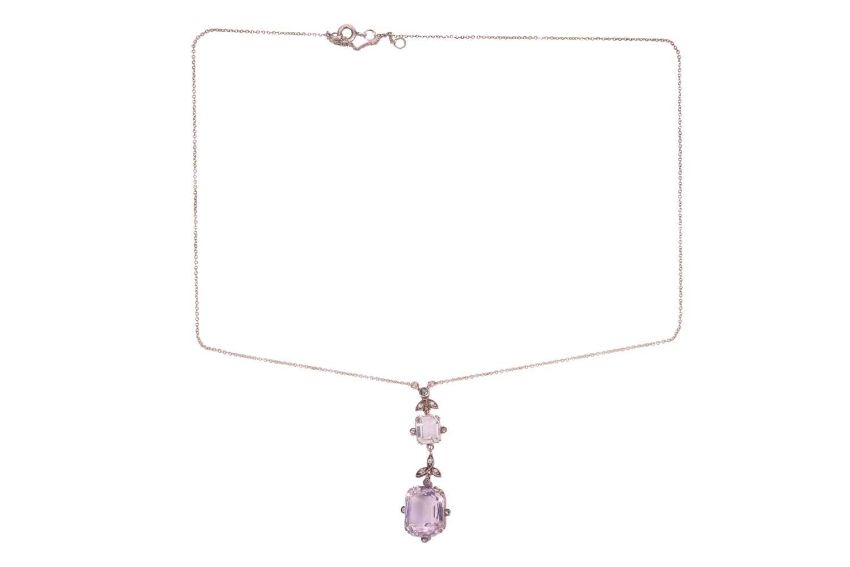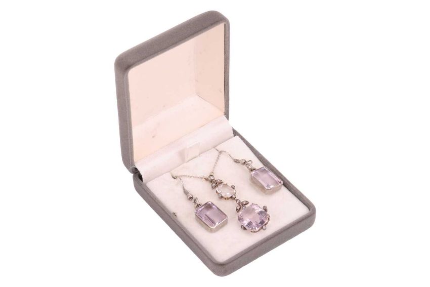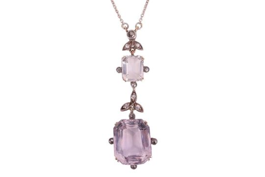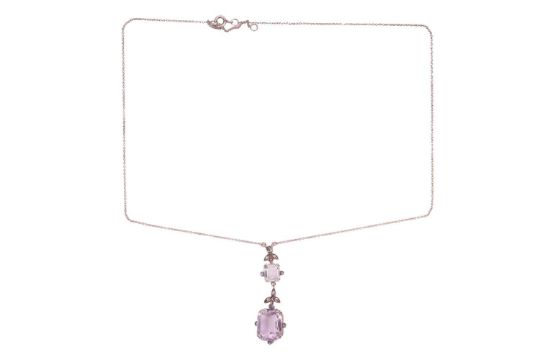 An Edwardian amethyst and diamond lavaliere necklace and a pair of earrings; the pendant of floral design, comprising a pale octagonal-cut amethyst of 15.2 x 12.4 x 8.5 mm, in claw setting with diamond accents to the cardinal points, to a conforming surmount set with a rock crystal, 4.8 cm drop length, on a 52.0 cm long fine cable link chain; together with a pair of step-cut amethyst drop earrings, measuring 14.1 x 10.3 mm, hook fittings; unmarked white metal testing as silver; total weight of items 12.3 grams. (2)