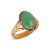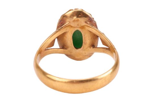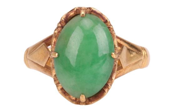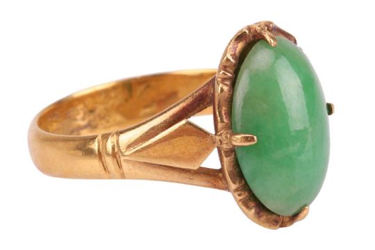 A jadeite-set dress ring, composed of an oval-cut jadeite cabochon, in a four-prong setting, to a yellow metal shank surface tested as 18ct gold, size L; 3.6 grams.