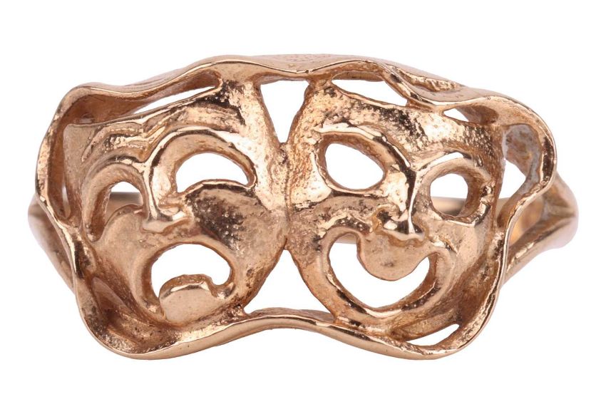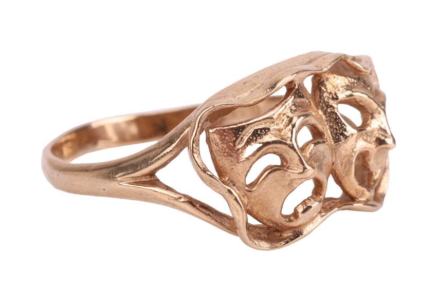 A 9ct yellow gold comedy and tragedy mask ring, size N, 2.5 grams.