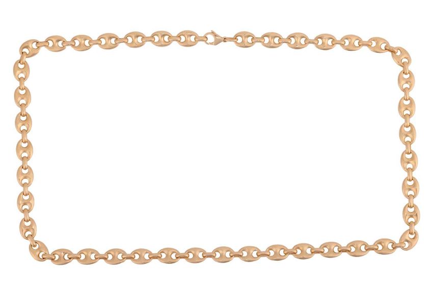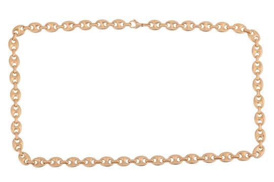 A long heavy anchor link chain, fastened with lobster clasp, marked as '750', link width 8.9 mm, overall measuring 60.5 cm in length, total weight of item 95.63 grams.
