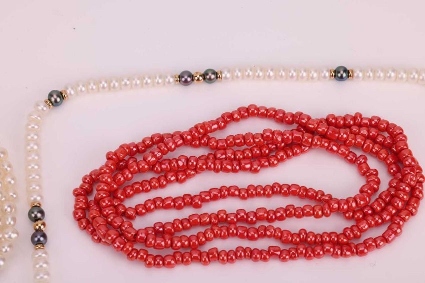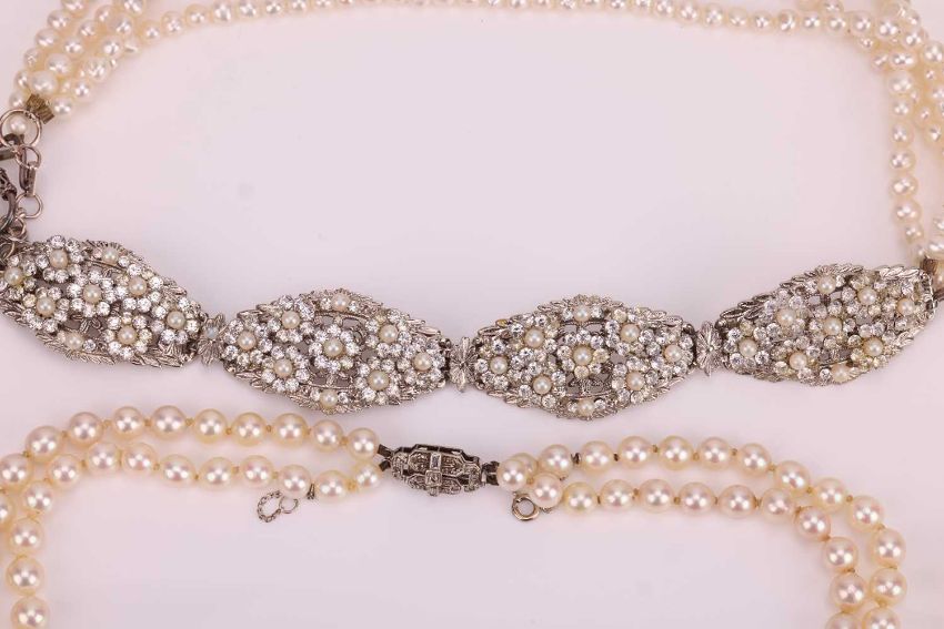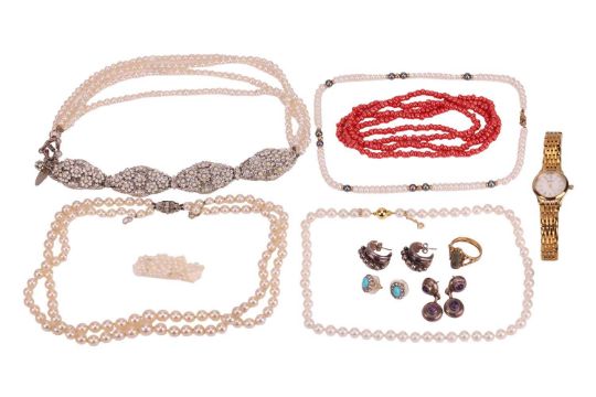 A double row of slightly graduated cultured pearls to a diamond set clasp marked '9ct', together with a single row of uniform size cultured pearls, to a spherical clasp marked '375'; a freshwater pearl, hematite and gold bead necklace; a yellow metal and moss agate dress ring, a gold plated Rotary wristwatch and a small quantity of other jewellery.