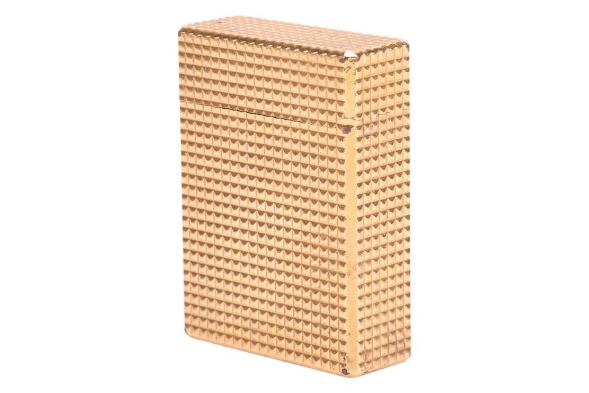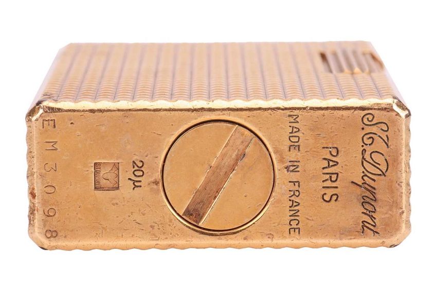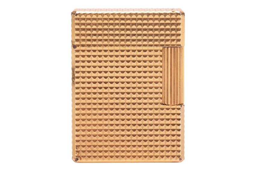 An S.T. Dupont gold-plated lighter with cross-hatched patterns, cover with vacant square catouche, signed and bearing French assay marks.