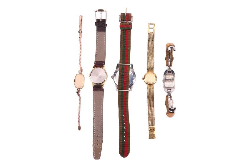 colleciton of five vintage watches to include a gold Omega, a cintage omega on relplacement strap, a gold longines watch, a Gucci watch and a Lorus watch