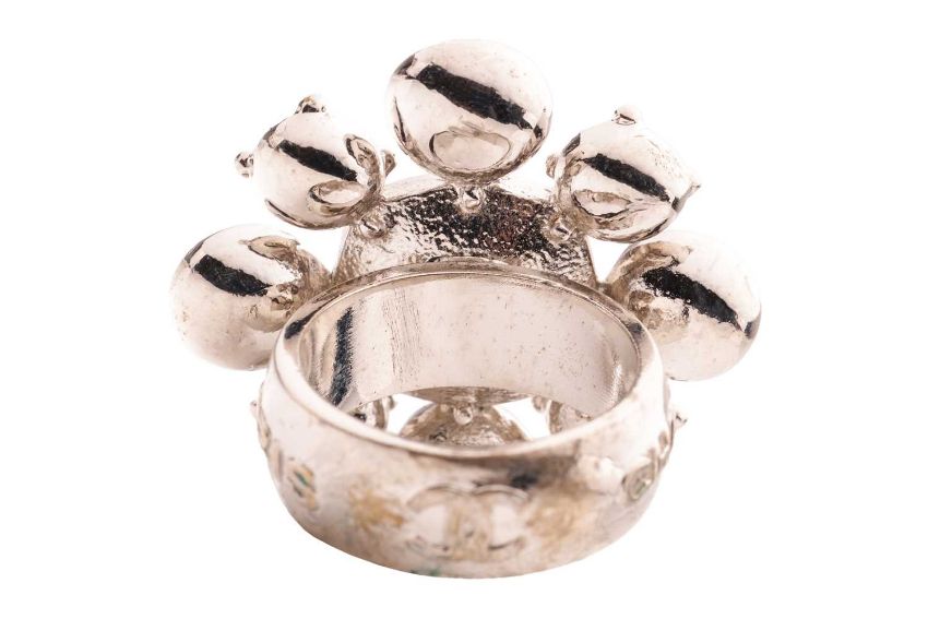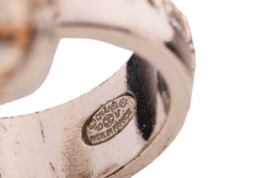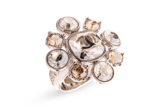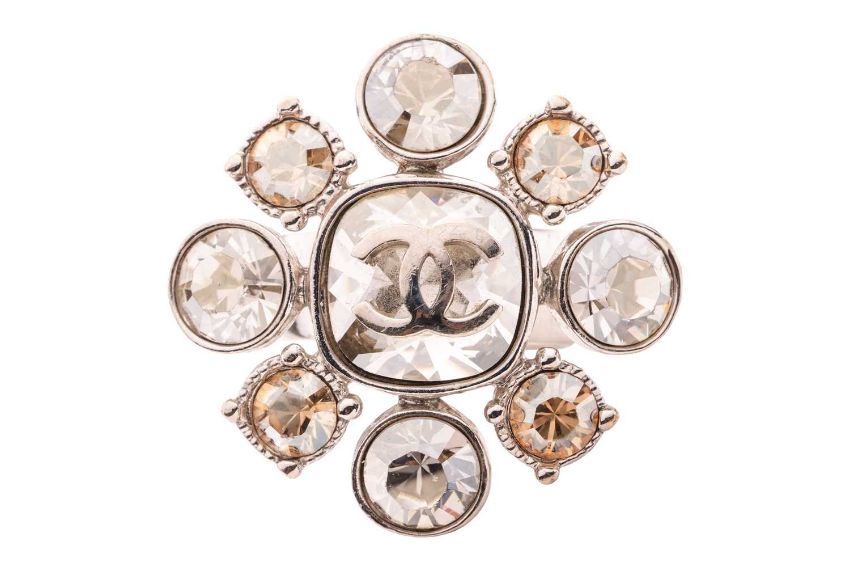 Chanel - a crystal cocktail ring, the floral cluster centred with an applied CC logo motif, to an embossed shank, oval plaque signed and marked '10 V', size N½.