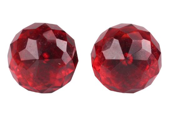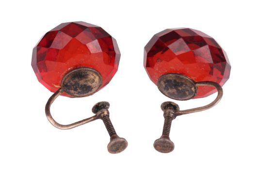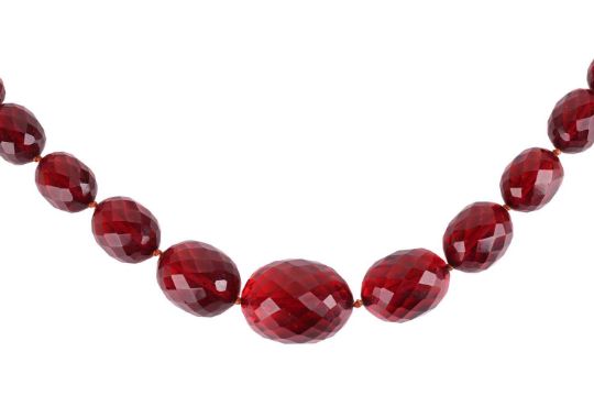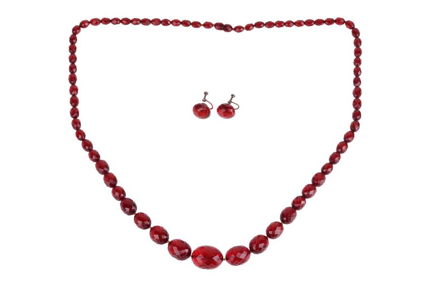 A cherry bakelite necklace and earrings set; the necklace comprising graduated faceted bakelite beads, largest measures 29.0 x 19.0 mm, smallest 9.5 x 6.6 mm, with a screw clasp, overall length 84.0 cm; together with a pair of matching earrings with screw-on backs, in metal stamped 'sterling'; total weight of items 70.3 grams. (2)