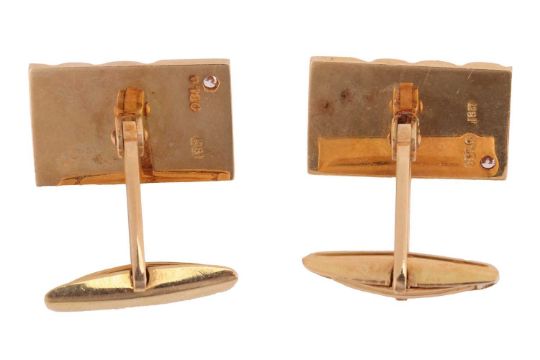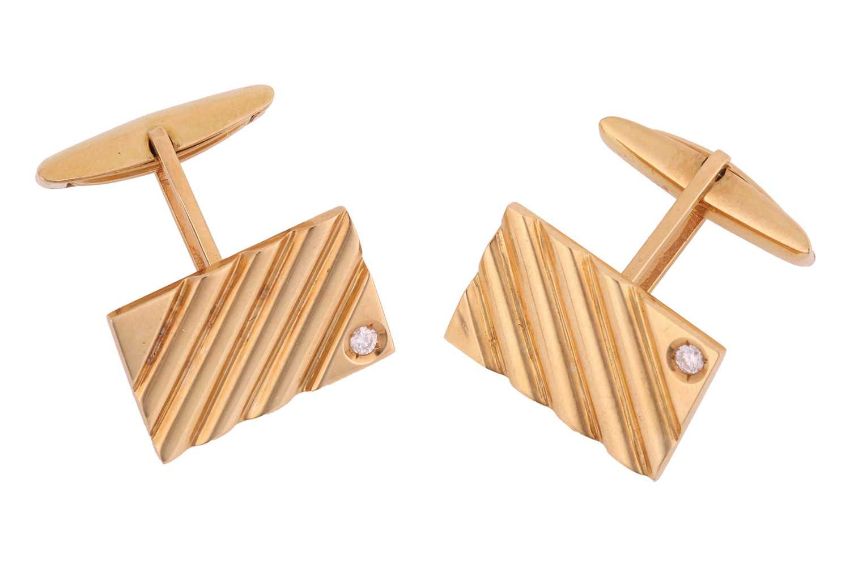 A pair of cufflinks with diamond accents, each comprising a diagonally striated rectangular panel, set with a round brilliant-cut diamond of 2.5 mm at the corner, fitted with cufflink swivels, yellow metal marked '18ct OBLO', panel measures 2.0 x 1.4 cm, total weight of items 15.3 grams.