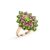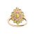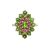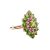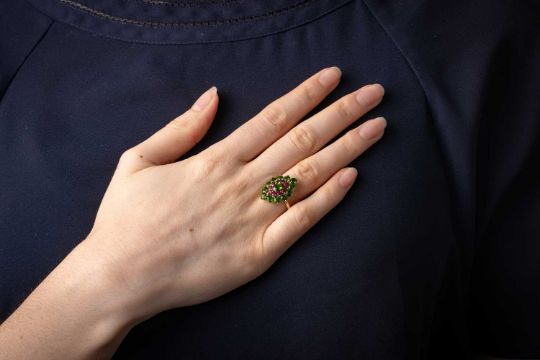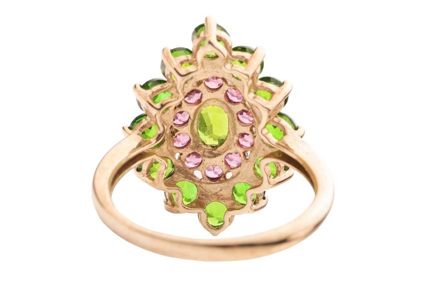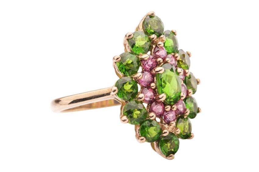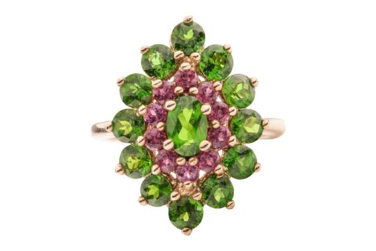 A chrome diopside and garnet cluster ring in 9ct yellow gold, the navette-shaped cluster centred with an oval-cut chrome diopside, framed by a frame of circular-cut garnets and an outer frame of circular-cut diopsides, between tapered shoulders, British hallmarks, signed 'QVC', ring head 2.4 x 2.2 cm, size O, 3.7 grams.