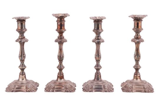 A set of four Victorian Elkington & Co of Birmingham EPNS table candlesticks of George II style with removable drip pans, double knopped columns and moulded and loaded bases, 26.5 cm overall height