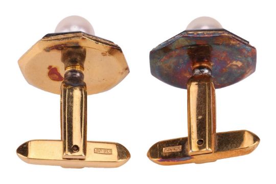 A pair of octagonal panel cufflinks set with onyx and cultured pearl, toggle back, stamped 'K18 GF' for gold-filled.