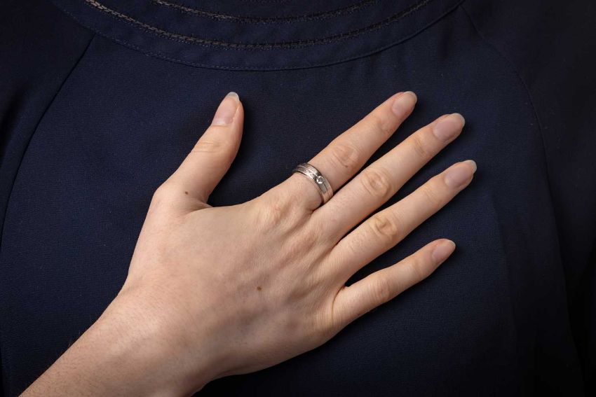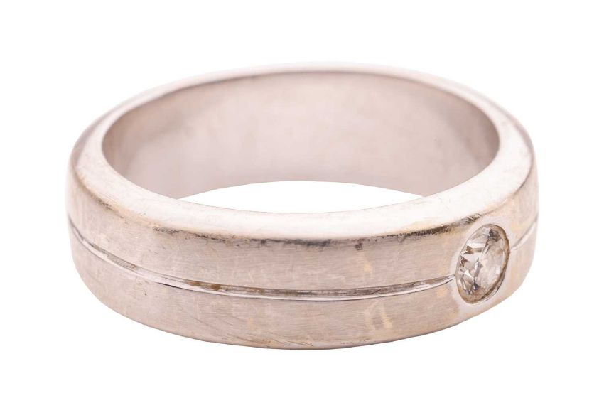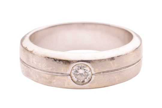A diamond-set dress ring, flush-set with a round brilliant-cut diamond with an estimated weight of 0.20ct, to a band with a central indentation, Indian assay marks '750', size P, 10.0 grams.