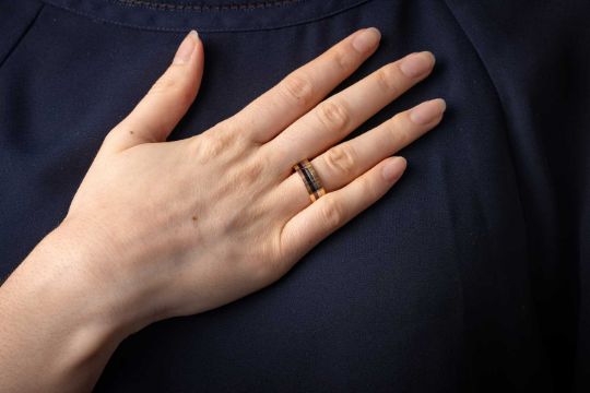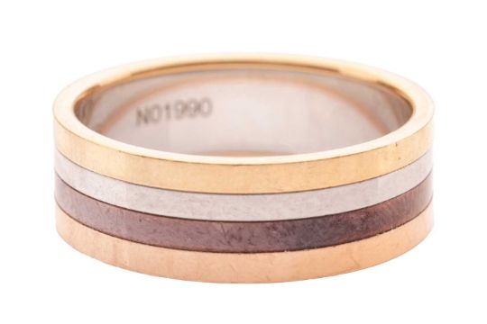 Boucheron - 'My First Four' quatre ring, the polished flat band of tri-coloured metal with a segment of PVD coating, signed and numbered, Swiss assay marks for 18ct, size P (EU size 56), 5.3 grams.